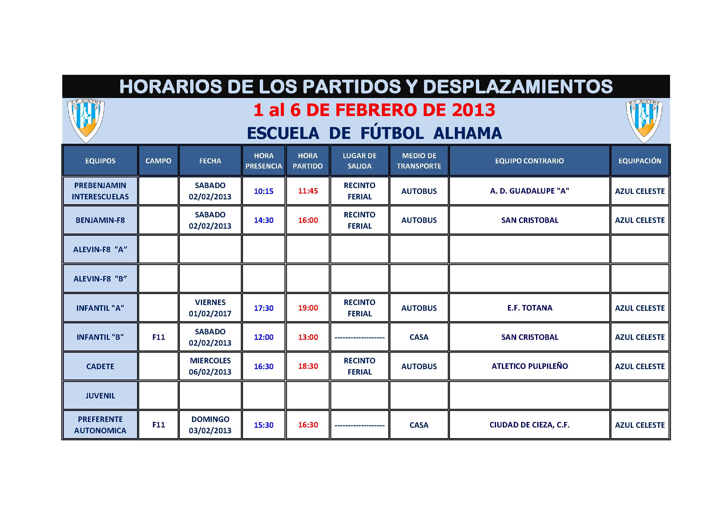 Horarios jornada 1 al 6 de Febrero 2013.