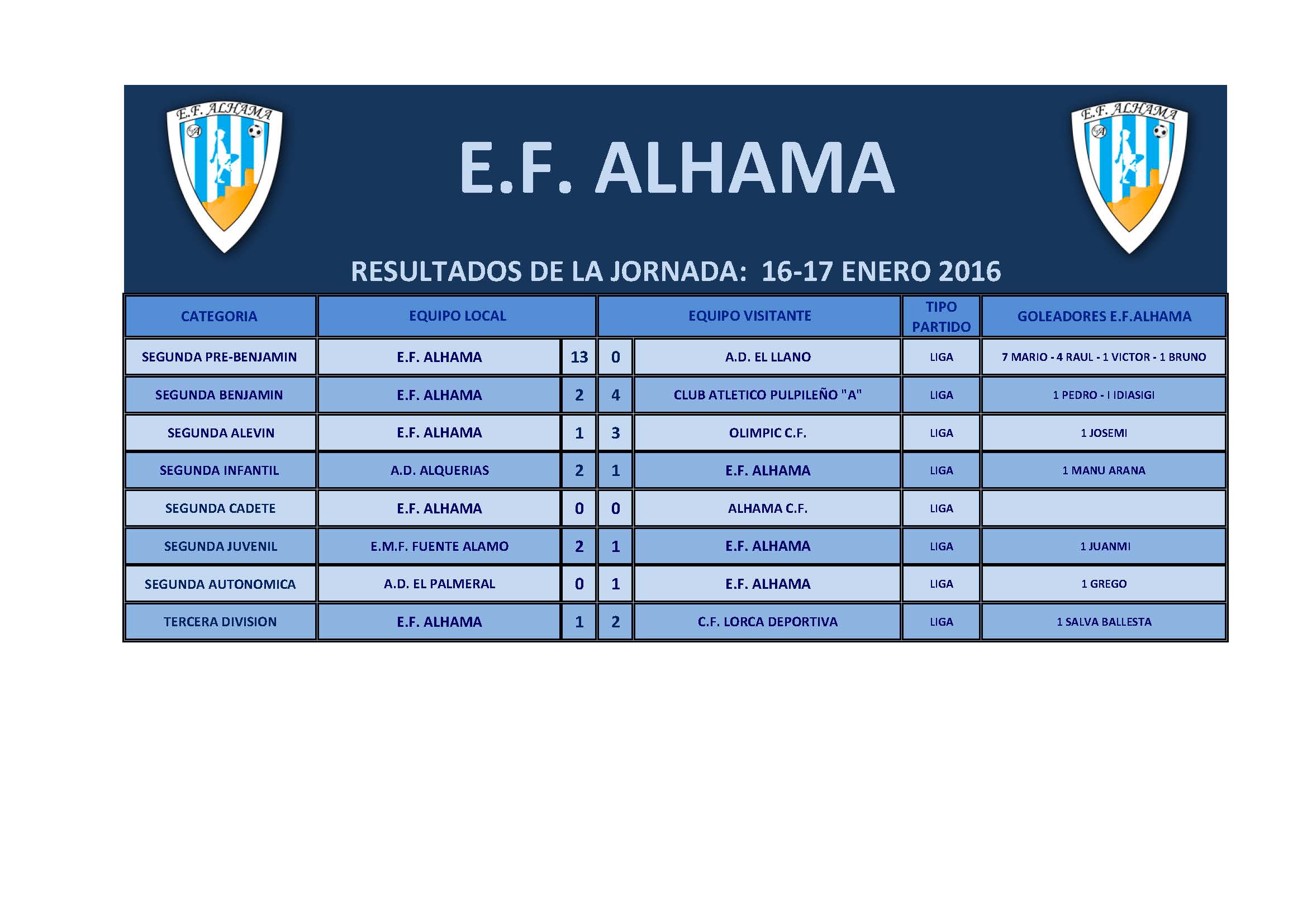 Resultados de la jornada, del fin de semana de 16-17 de Enero de 2016