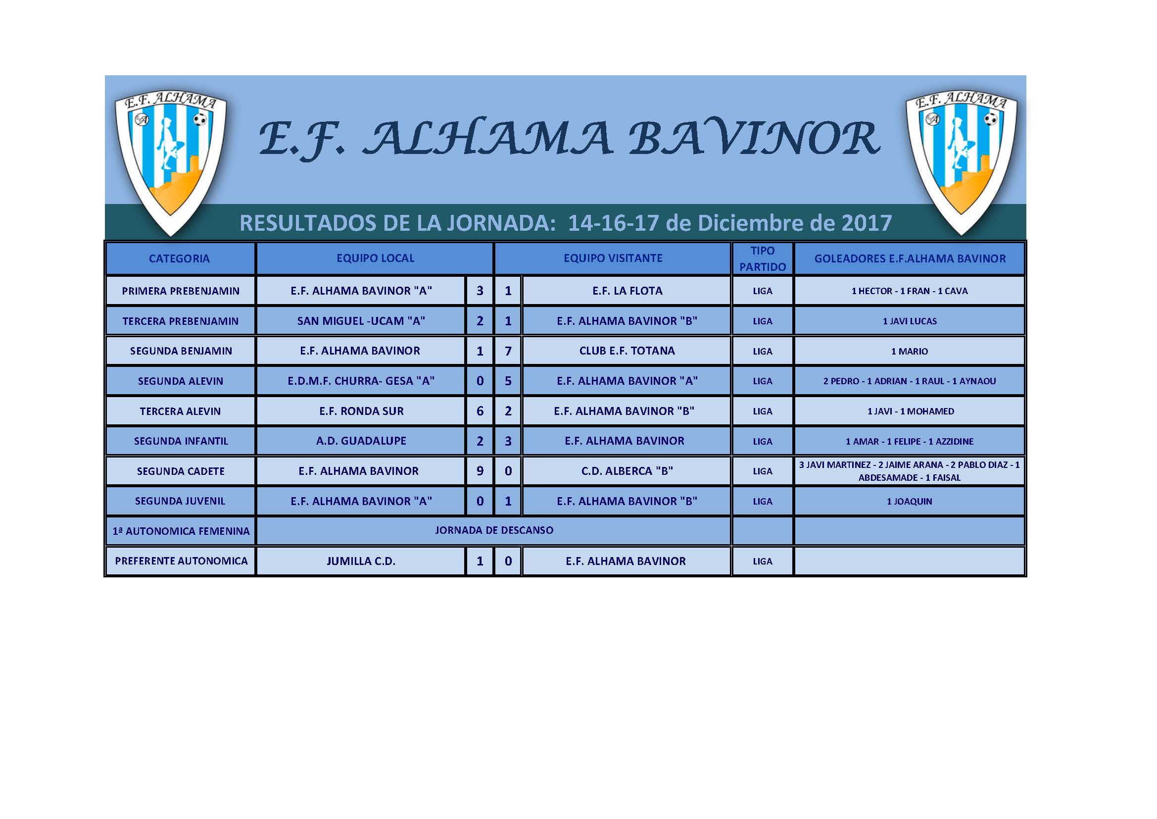 E.F. ALHAMA BAVINOR A 0 – E.F. ALHAMA BAVINOR B 116 de diciembre de 2017 – Jornada 11ª Campo Municipal de Fútbol «José Kubala» de Alhama de Murcia