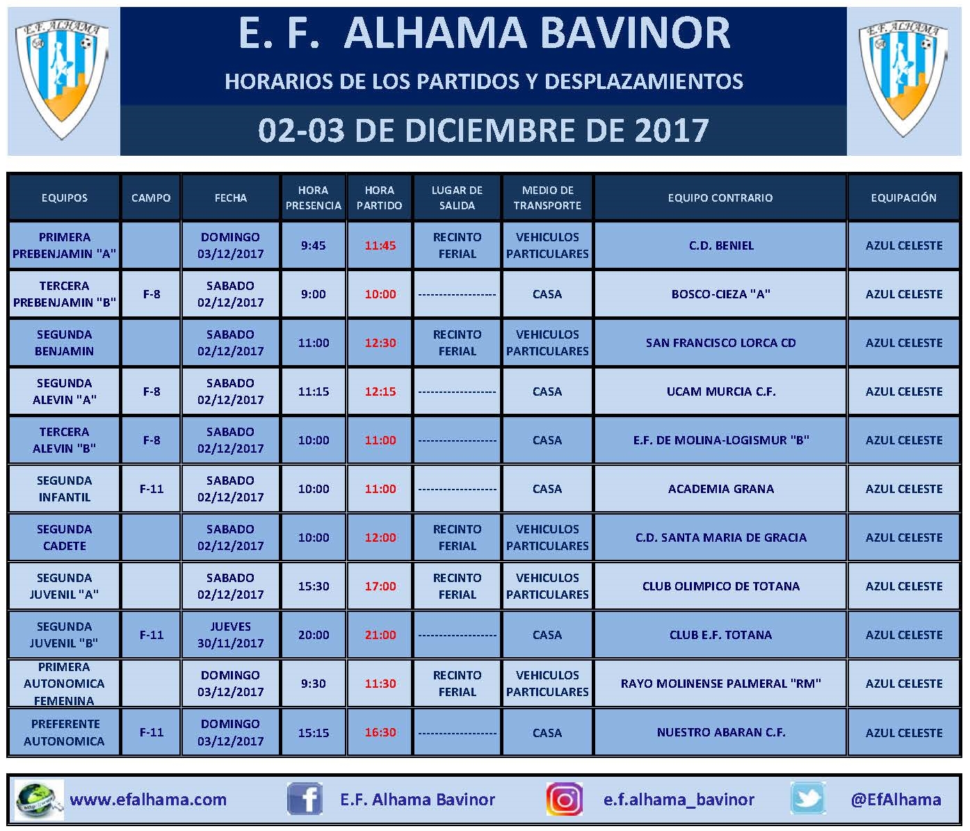 Horarios de los partidos y desplazamientos del fin de semana de 2-3 de Diciembre de 2017.