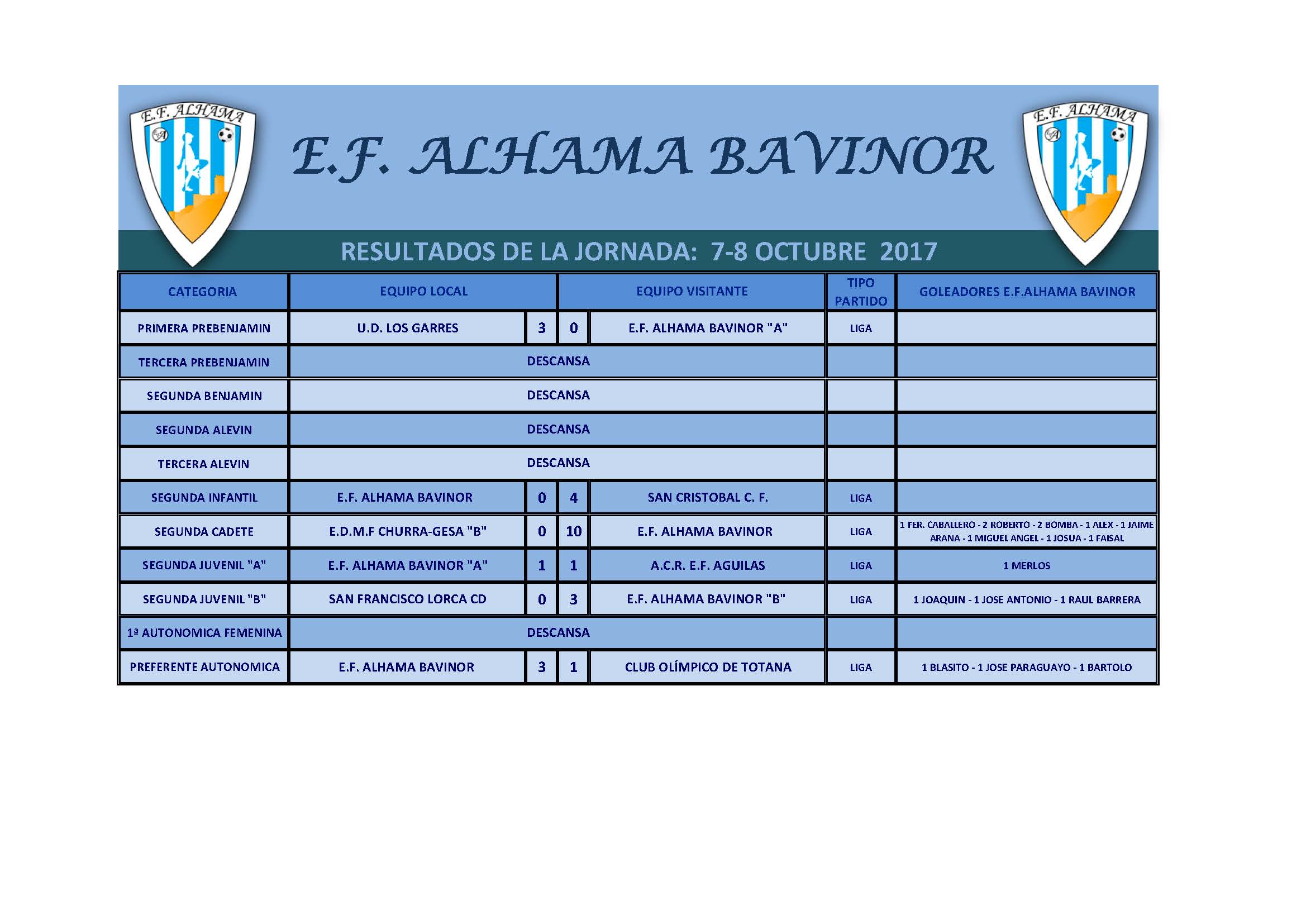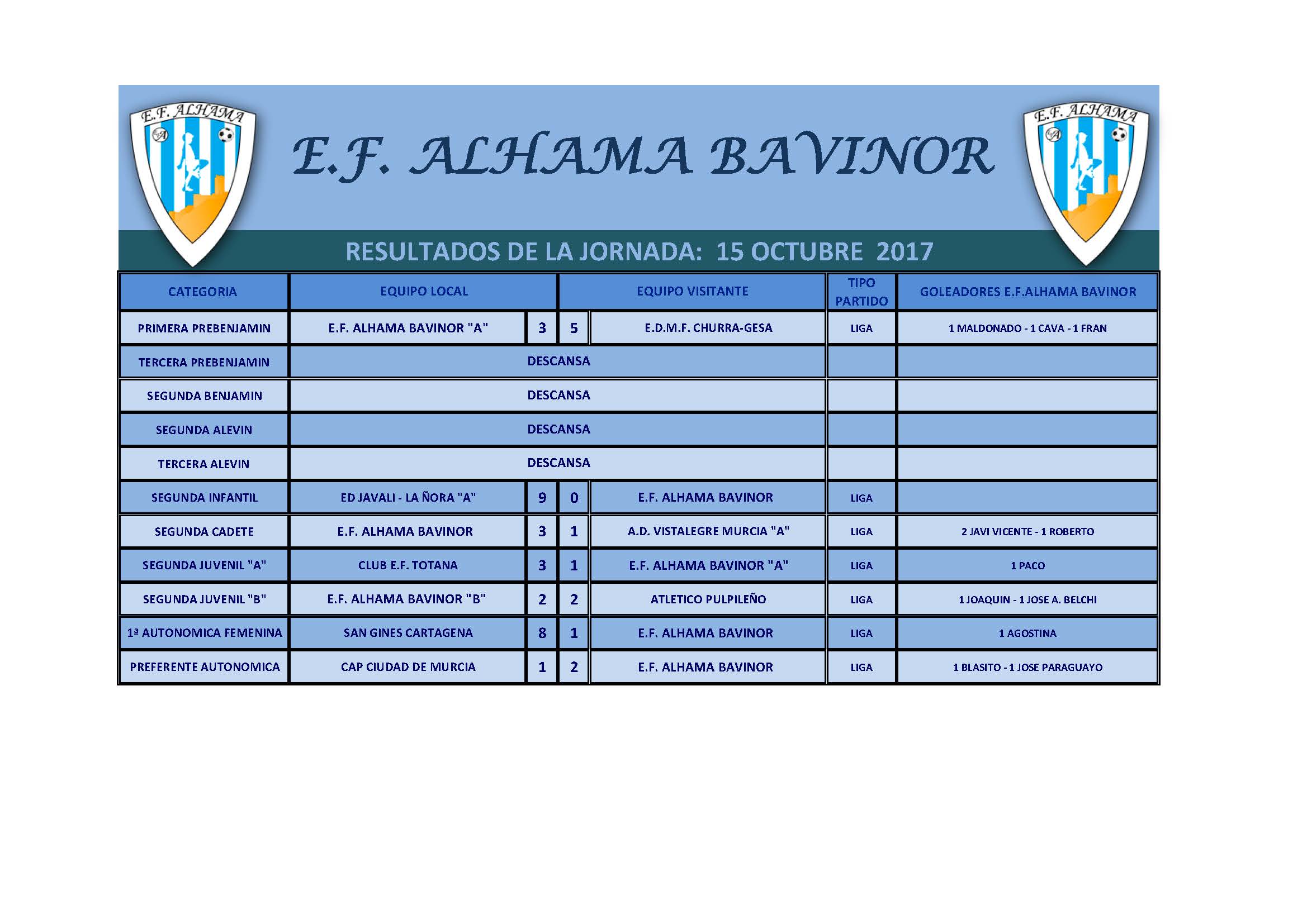 E.F. ALHAMA BAVINOR 3 – E.D.M.F. CHURRA GESA 515 de octubre de 2017 – Jornada 4ª Campo Municipal de Fútbol «José Kubala» de Alhama de Murcia Primera Prebenjamín – Temporada 2017-2018