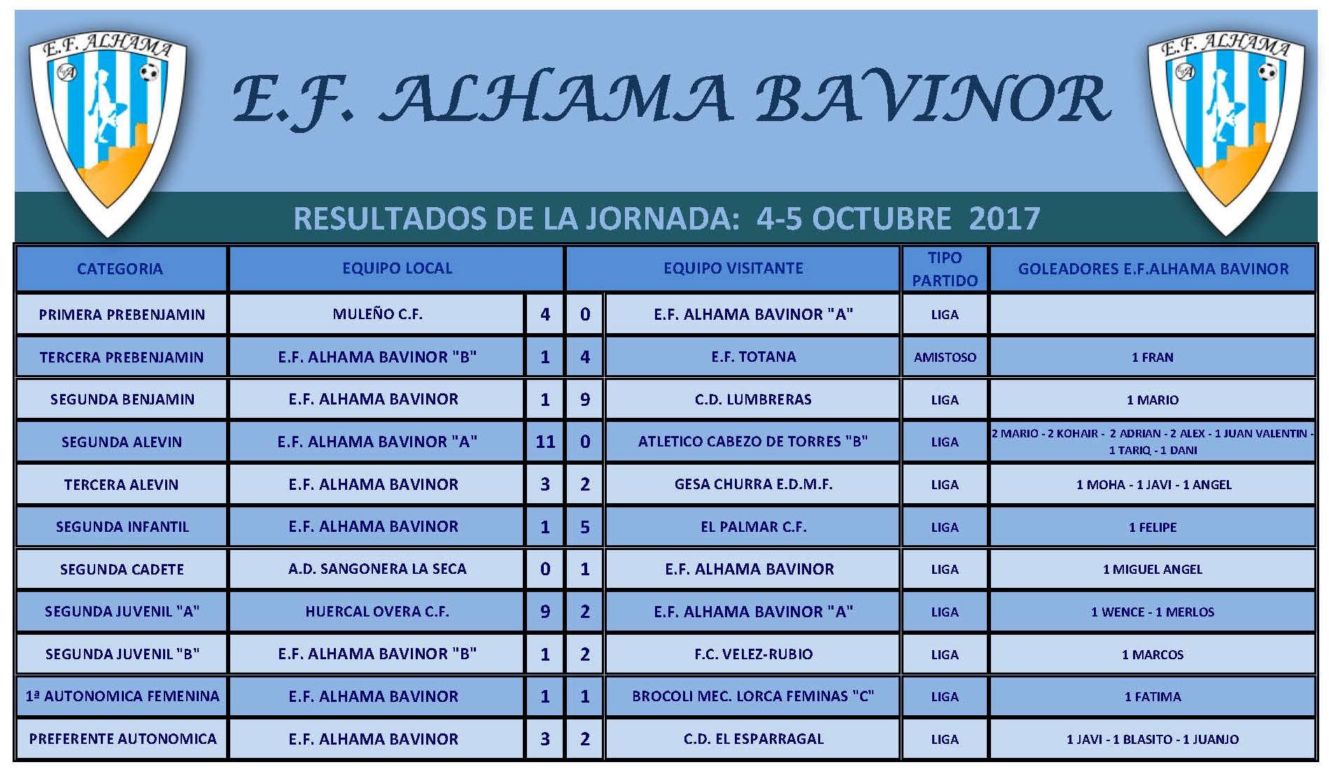 E.F. ALHAMA BAVINOR A 1 – PEÑA MADRIDISTA DE LORCA C.D. 411 de noviembre de 2017 – Jornada 7ª Campo Municipal de Fútbol «José Kubala» de Alhama de Murcia