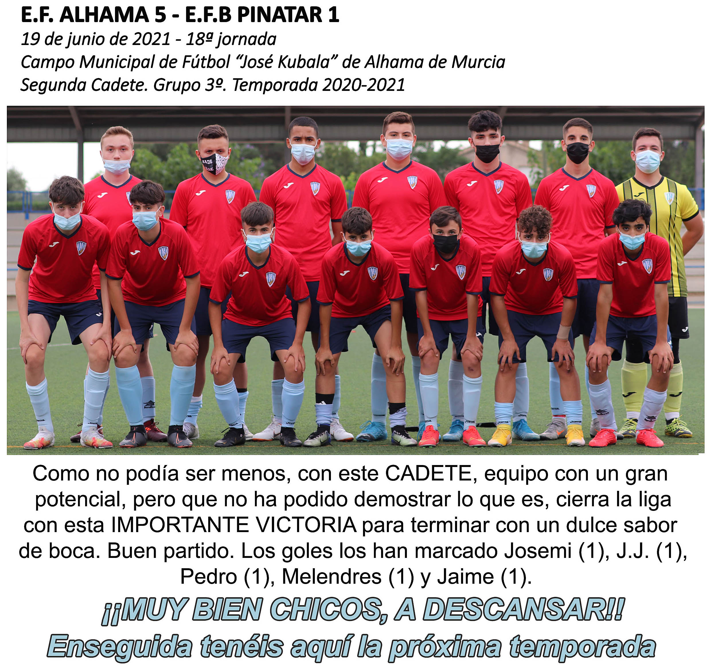 Tercer amistoso del JUVENIL de primera y tercera VICTORIA. Hoy, domingo 5 de septiembre, se ha enfrentado a otro primera el Javalí Nuevo. El resultado ha sido de 2-1 con goles de Edu (1) y Amar (1). La semana próxima, primera jornada de liga.